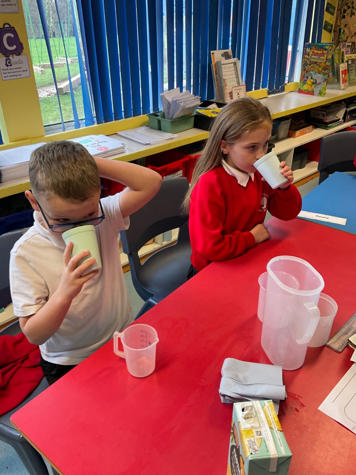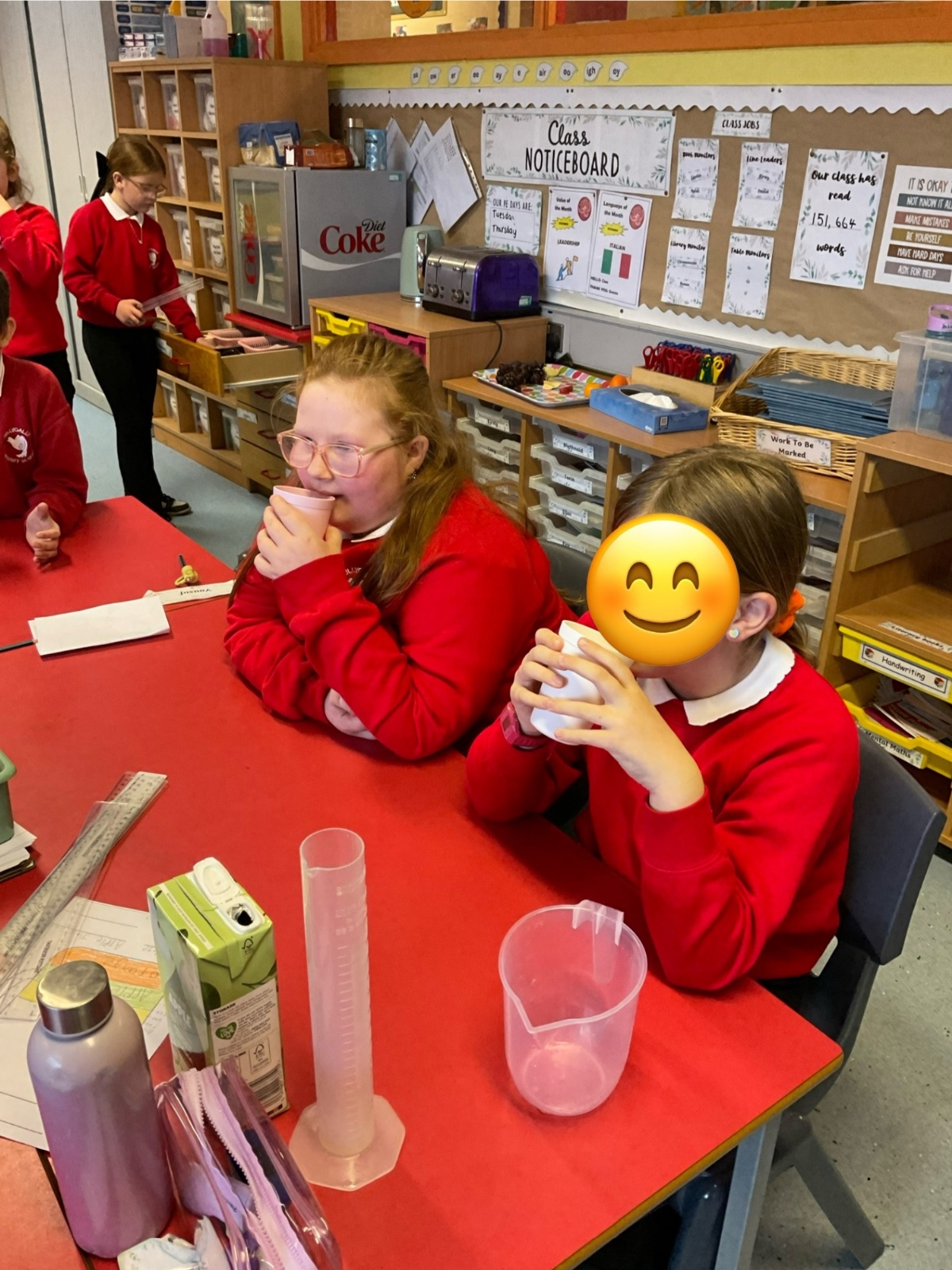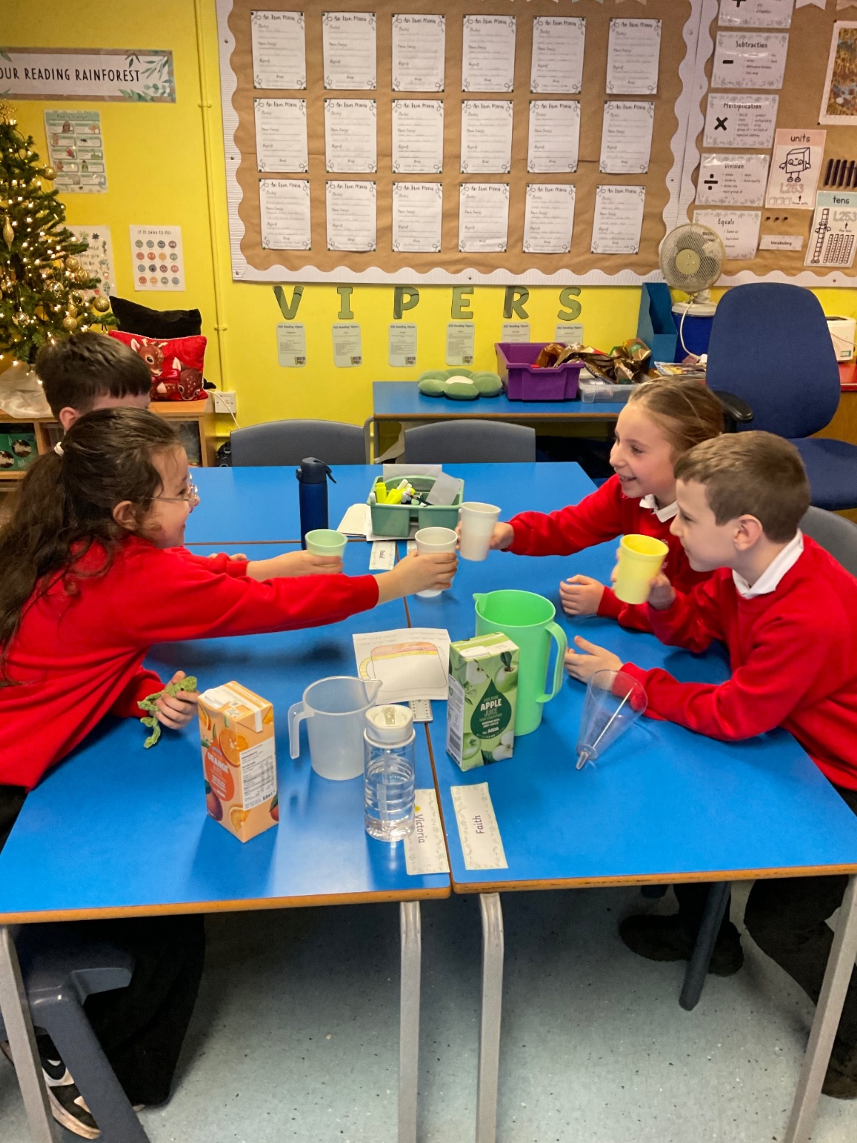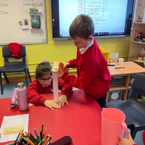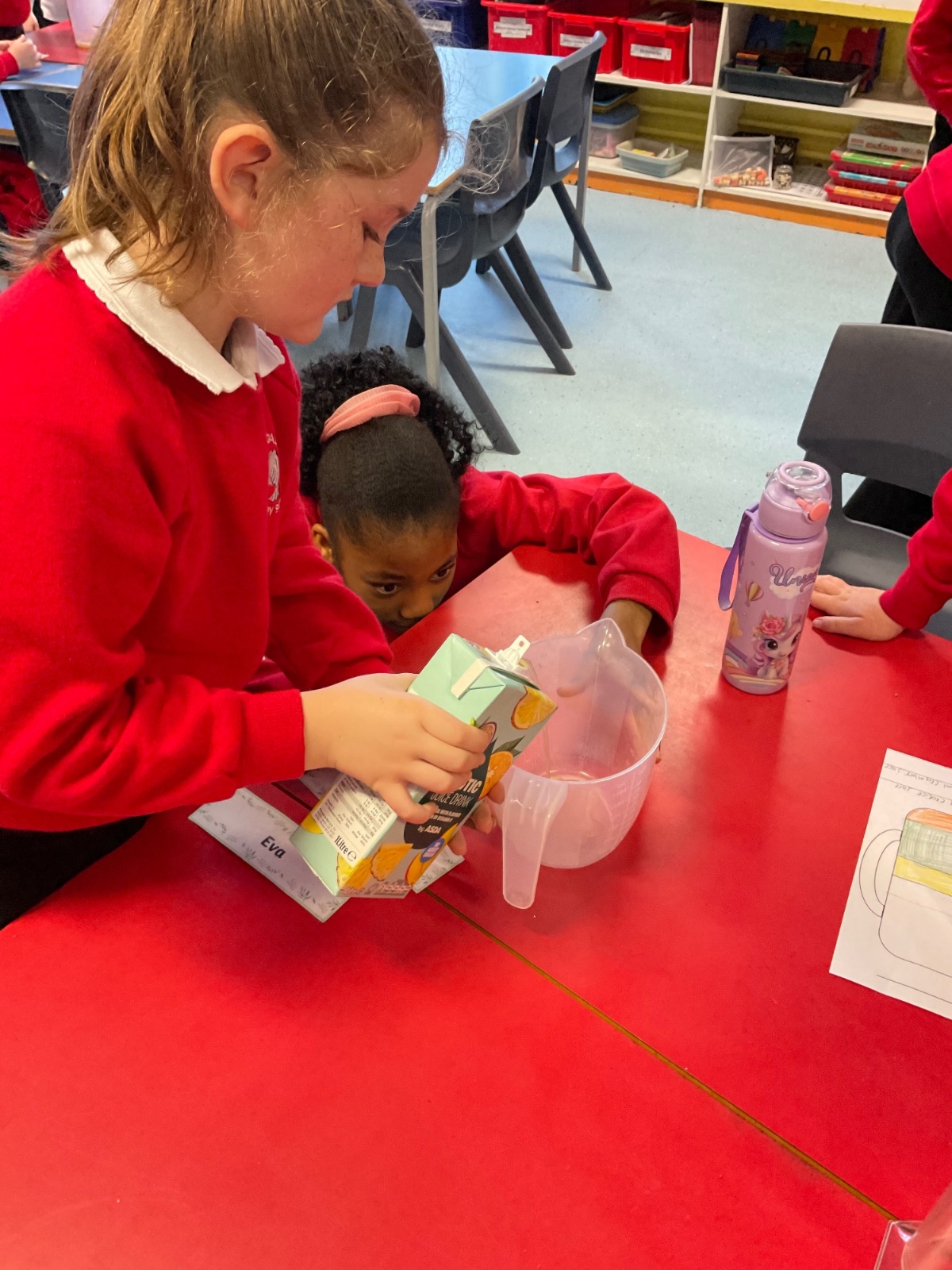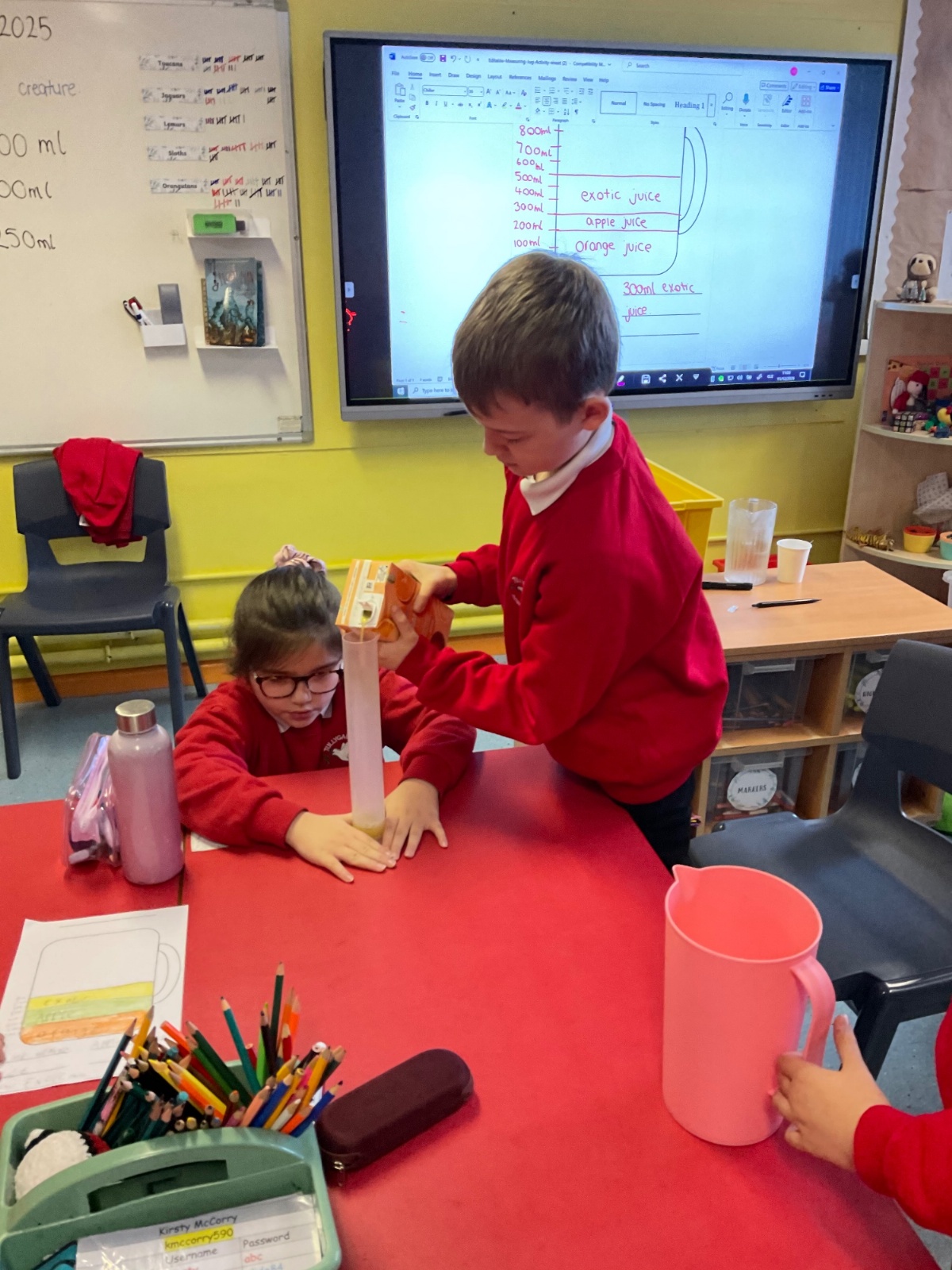 Today we made capacity concoctions! We began by discussing what juices we would like to include in our drinks and recording this on our worksheets. We measured each juice carefully in millilitres, using a range of tools like jugs, cups, and syringes. We talked about which containers held more or less and experimented with mixing amounts together. The best part was tasting our creations at the end and seeing how our measurements turned into yummy drinks!